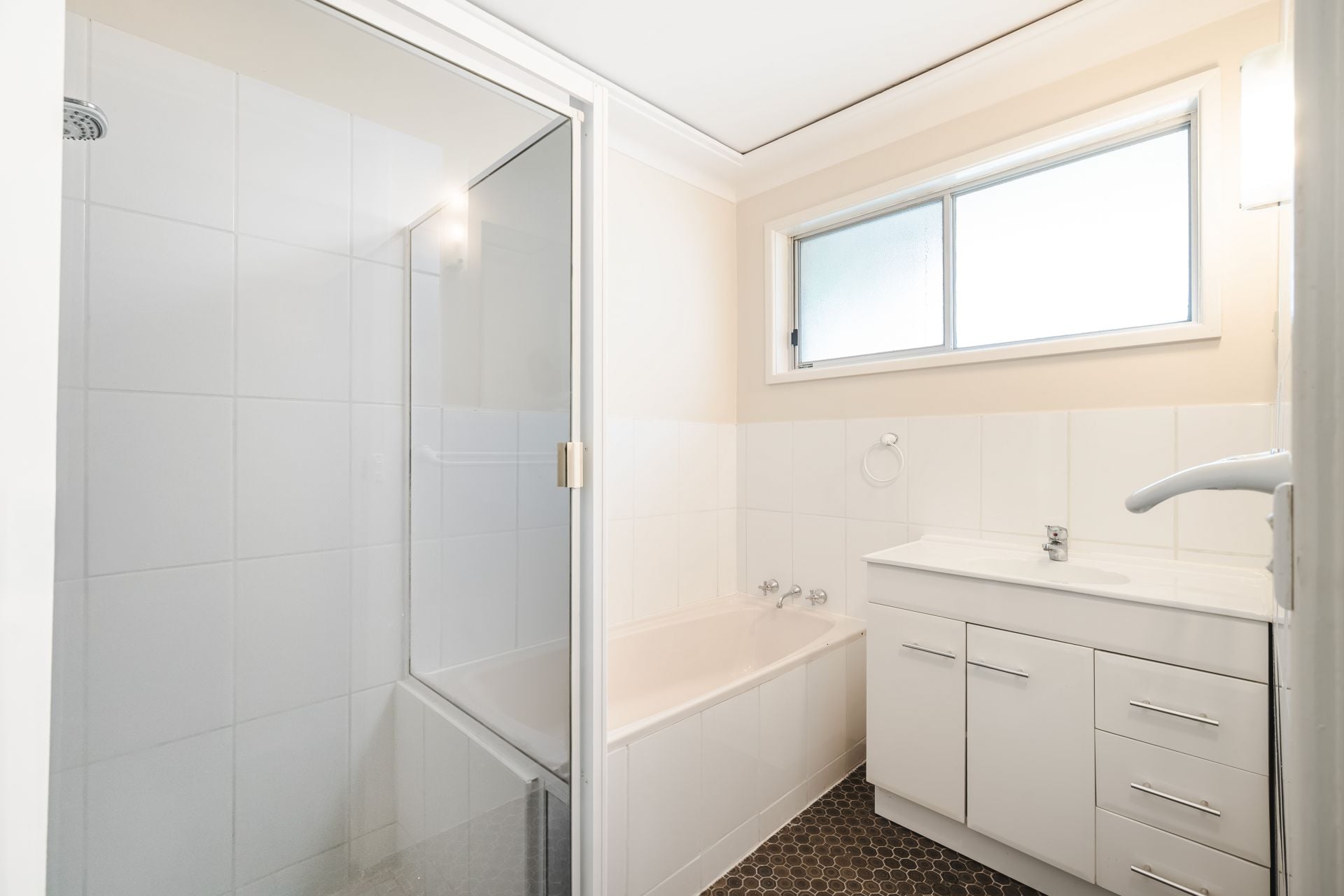 Updated bathroom with bath and corner shower